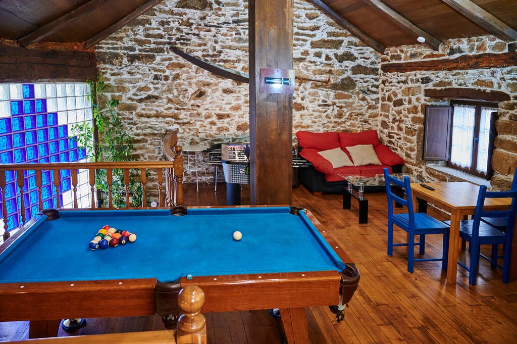 Salón con chimenea + sala de juegos (con billar, futbolín, ping-pong…) ideal para grupos o familias.